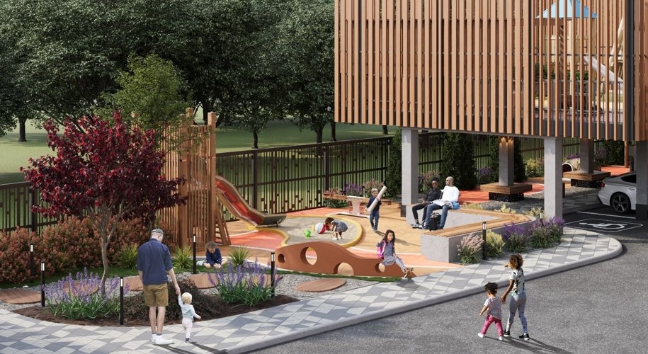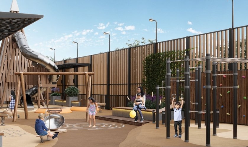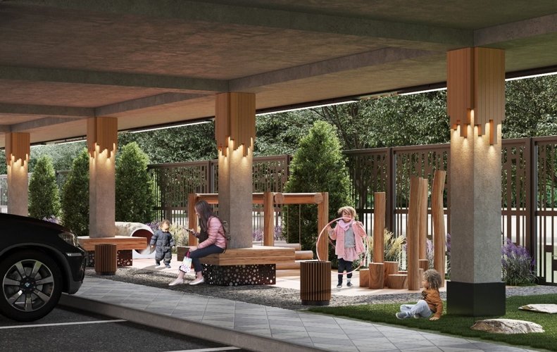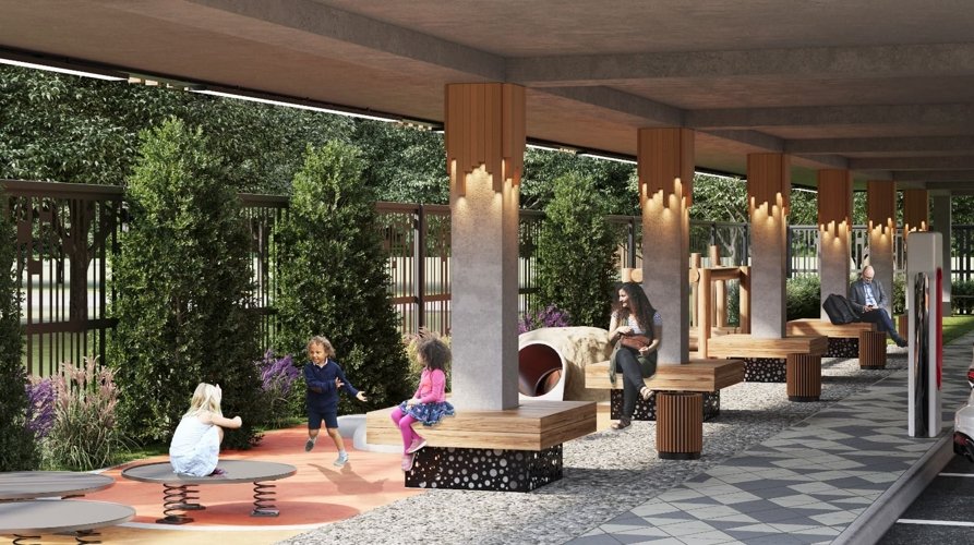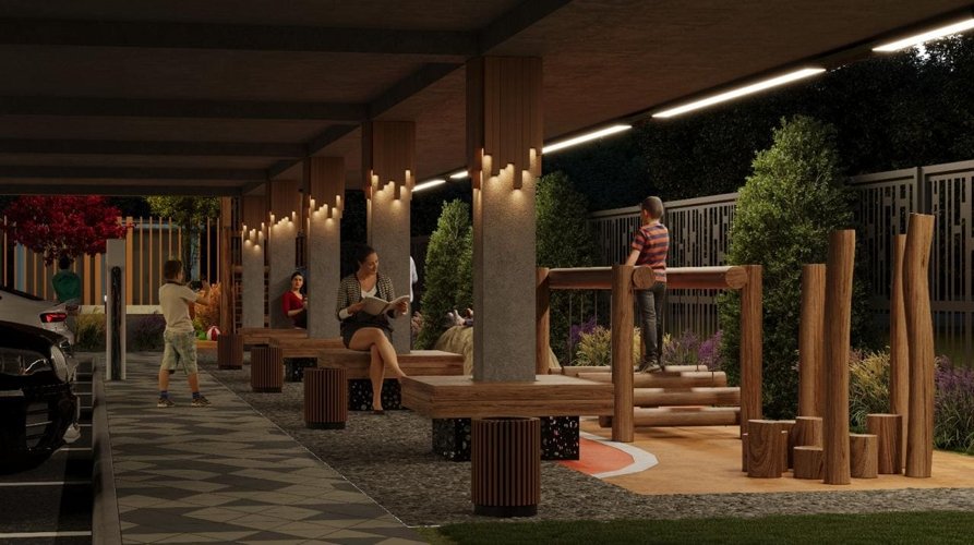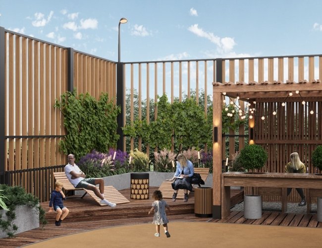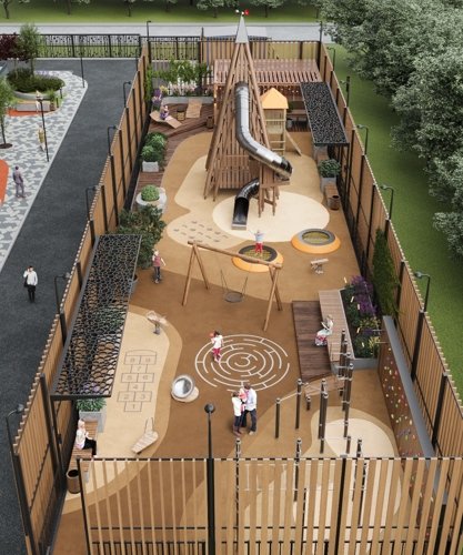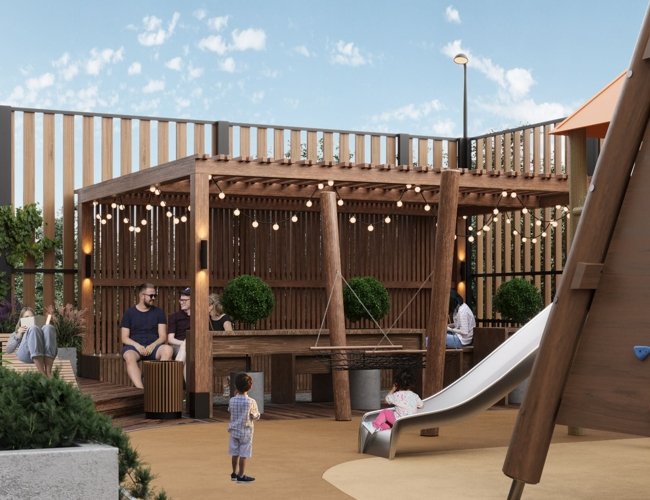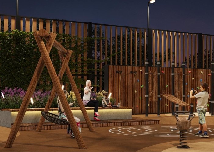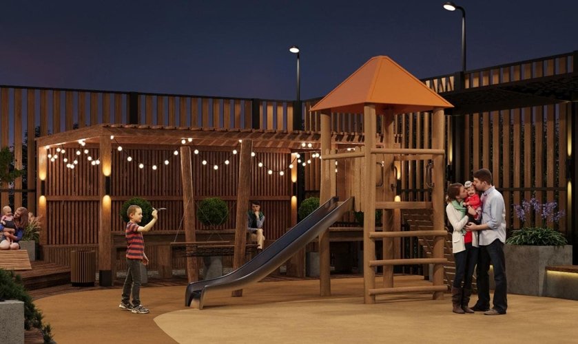 Предусмотрены места для отдыха взрослых, площадки для воркаута, йоги, настольного тенниса и шахматные столики.