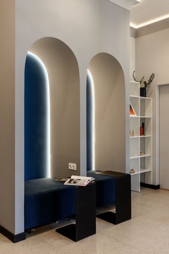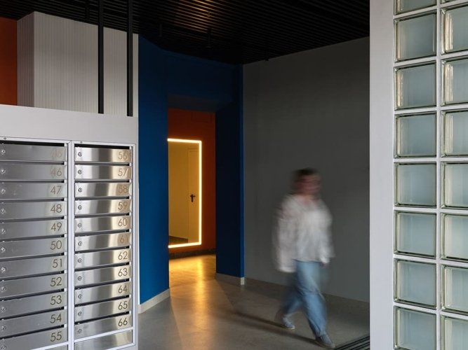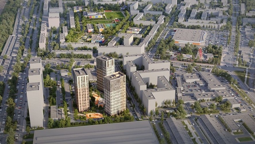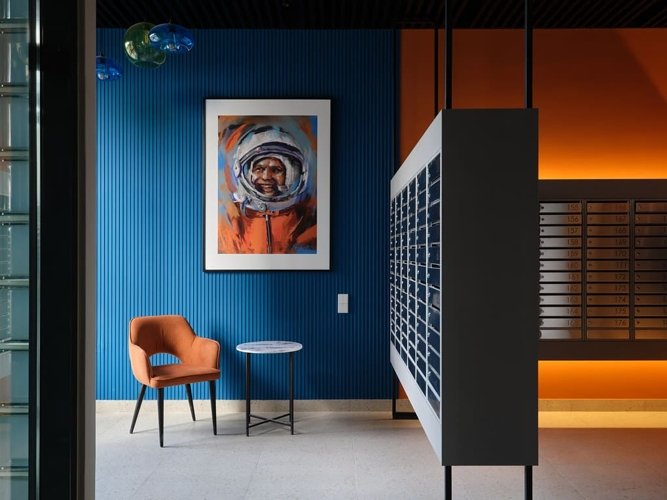 Внешний вид комплекса отсылает к периоду, когда каждый мечтал о космосе. Здания стремятся ввысь, а большая площадь остекления, в которой отражается небо, делает дома воздушными.