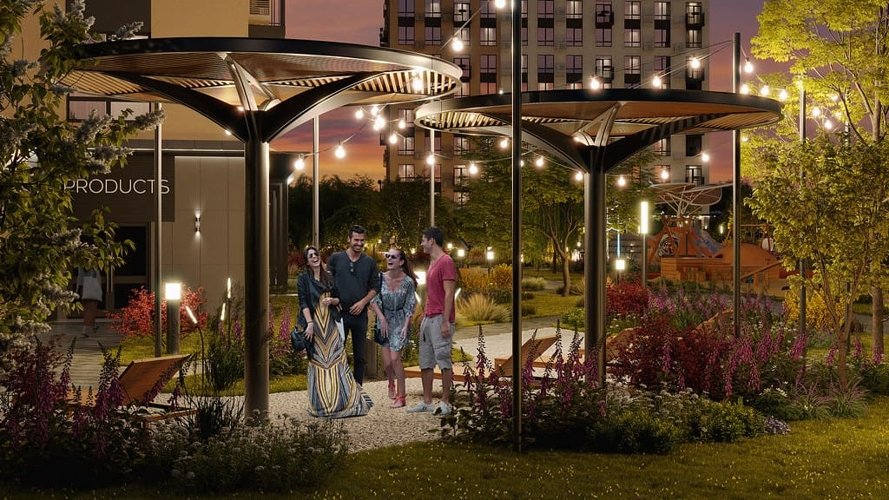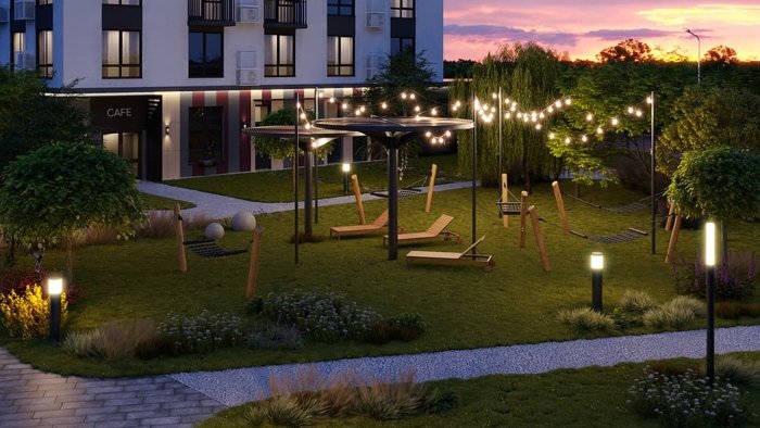 Двор комплекса освещен сотнями светильников от ведущих производителей. Вам будут доступны комфортные и безопасные прогулки даже в темное время суток. Сочетание грунтовых, садово-парковых светильников, фонарей точечного и рассеивающего света создает уютную среду.