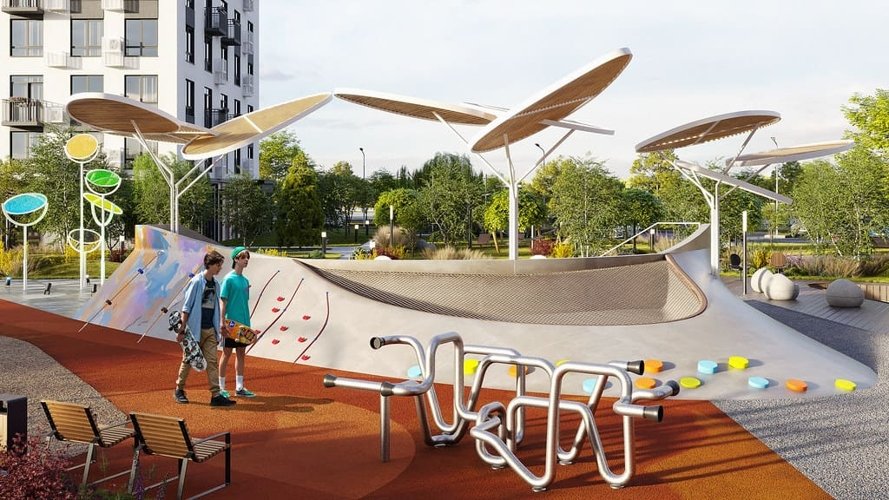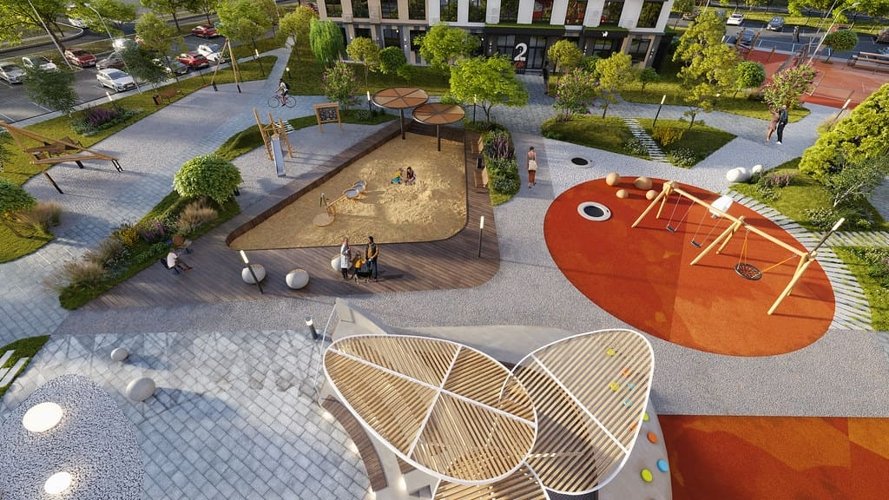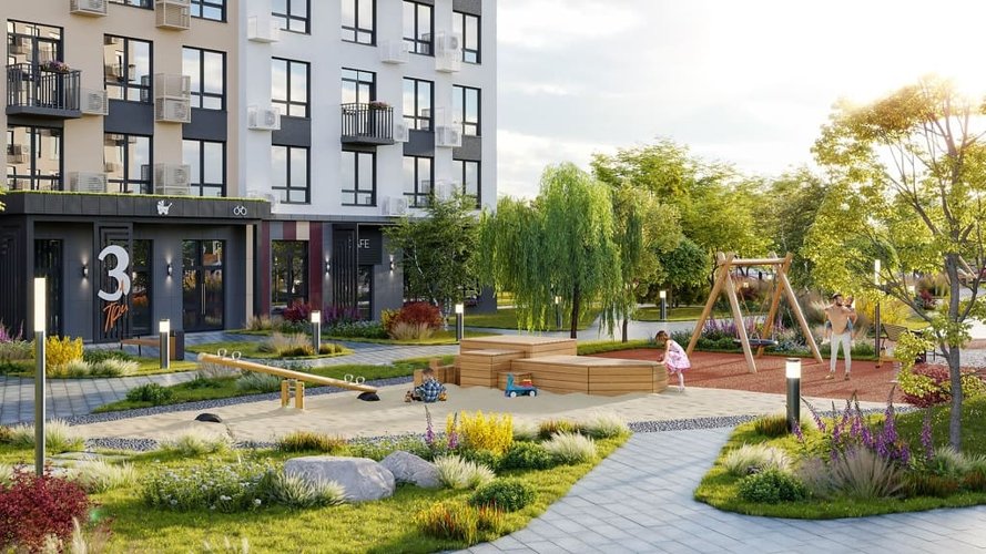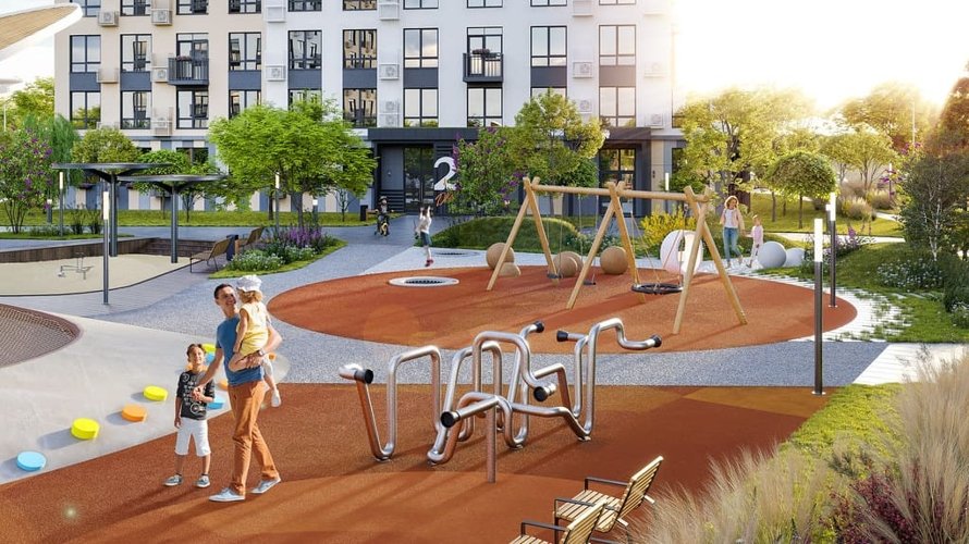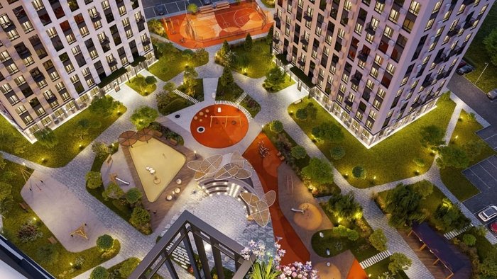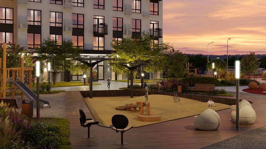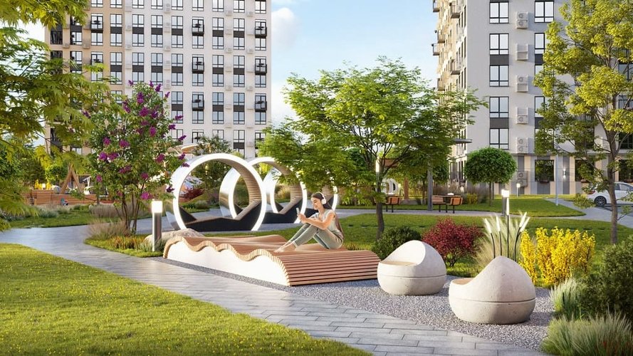 Двор-парк жилого комплекса вобрал в себя все лучшие решения по благоустройству. Территория разделена на несколько пространств, где вы сможете отдохнуть всей семьей, провести время за любимой книгой и насладиться природой.
