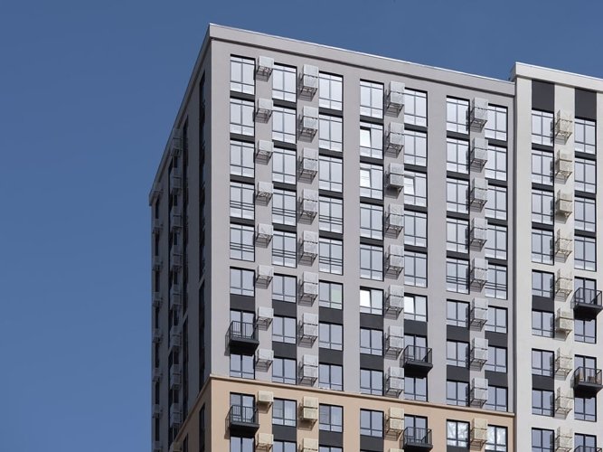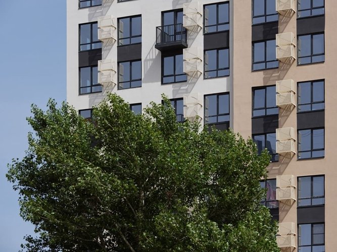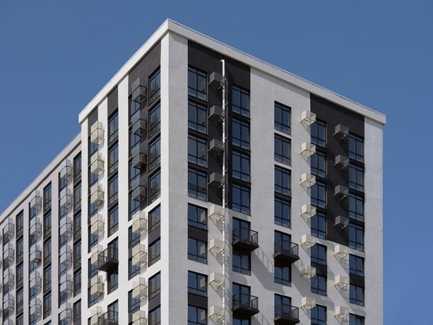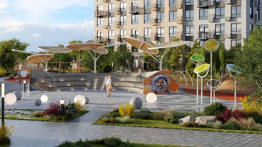 Внешний вид комплекса отсылает к периоду, когда каждый мечтал о космосе. Здания стремятся ввысь, а большая площадь остекления, в которой отражается небо, делает дома воздушными. Окна во всех квартирах жилого комплекса имеют отступ всего 50 см от пола, пять верхних этажей имеют панорамное остекление. Отсюда до звезд – рукой подать…