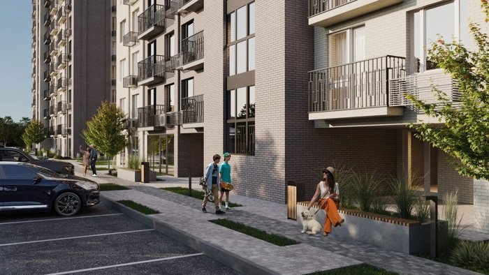 Дворовая территория разбита на несколько зон: прогулочные, детские с современными, безопасными площадками и спортивные, где есть весь необходимый инвентарь.